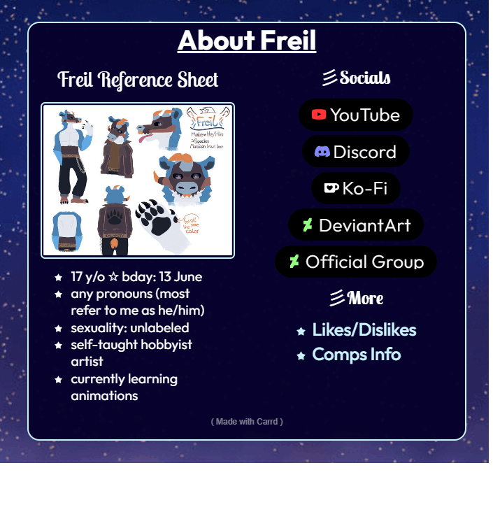 I initially wanted to use Ko-Fi as the only source to commission me but now changed my mind, the only thing closest to commissions I will post there are YCH templates or maybe even adoptables. If you want to support me you can do it by sending a little tip there and I'd be very grateful for your support <3I have a big goal there and I appreciate it if you consider donating because I want to one day make Freil lore a real thing as in I want to create a series.So what do I use Ko-Fi for now? I will mainly use it for my Freil lore progress or exclusive art/speed paints, etc. of my commissions, or generally things I've been working on.